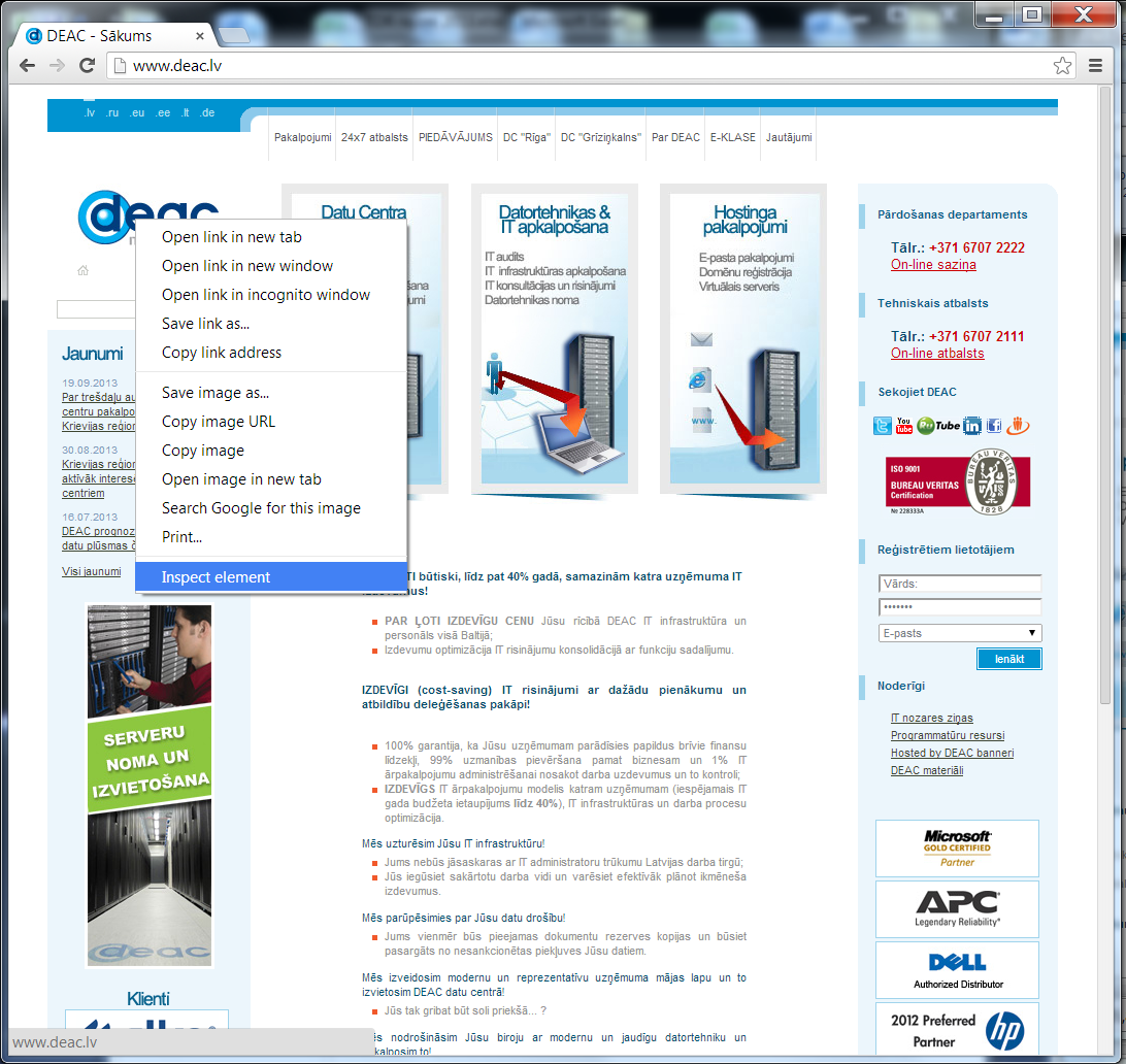 2) Izvēlamies jebkuru elementu (tā var būt arī reklāma), lapā peles poga tam virsū un izvēlamies “Inspect element”