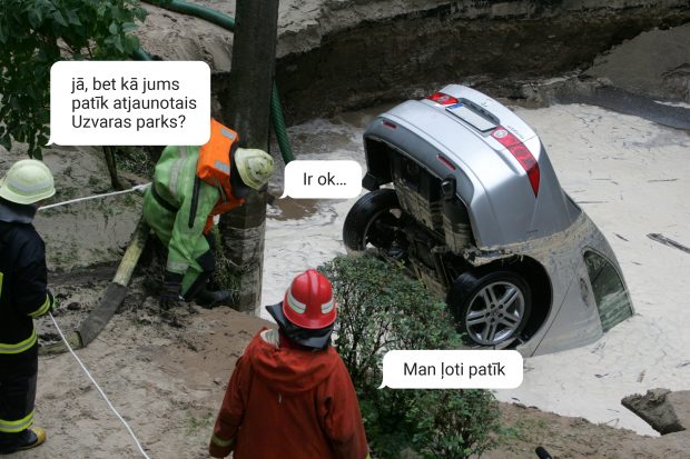 Šobrīd salūzusi ir Rīga. Ir bīstami atrasties gan uz, gan zem Zemitānu tilta. Vanšu tiltam pat ironiskās Latvijas simtgades plēves paspēja izbalēt un novecot kā morāli, tā fiziski. Ja pat valsts kontroliere nevar aizbraukt uz interviju televīzijā, nesadauzot mašīnai ratus, kā to var izdarīt parasts ierindas mirstīgais? Grausti. Netīrs gaiss. “Rīgas satiksmes” vadība, kas pavadīja apcietinājumā vairākus mēnešus. KNAB, kas Rīgas mēra garāžā kaut ko meklē.